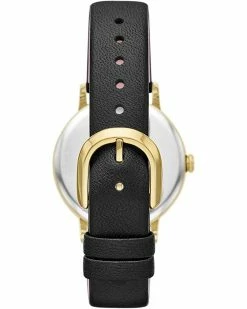 - 34 mm goldtone stainless steel case paired with a black leather strap.