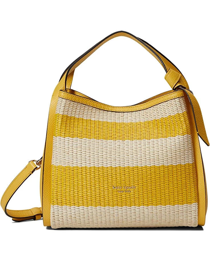 - An allover stripe design enhances the look of the Kate Spade New York® Knott Striped Straw Medium Crossbody Tote Bag.