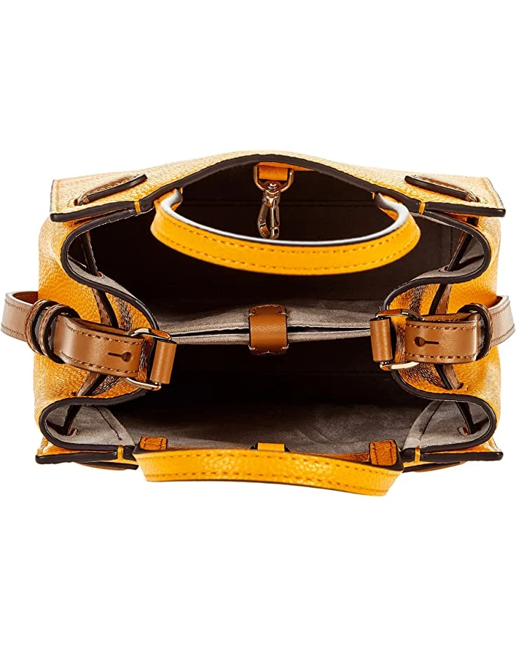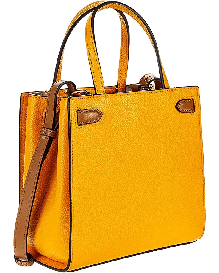 This is such a cute little bag. Love the color combinations. The yellow color brightens the gloomy winter days. I am always in good mood when I go out with this bag. It doesn’t hold much stuffs. But it works just fine with keys, small wallet, small pack of sanitizing wipes, phone. a full size wallet won’t fit. The leather is good and keeps the shape in place. The strap is not as soft as I thought. Bought it when it’s on sale. So for the price paid, this is an awesome bag to have and I have no regrets of buying it.