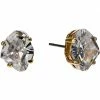 - Plated brass metal stud earrings with crystal heart accents.