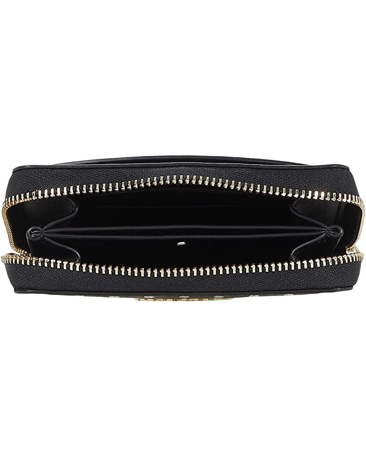 - Zip-around closure with polished metal hardware and pinmount logo detail.